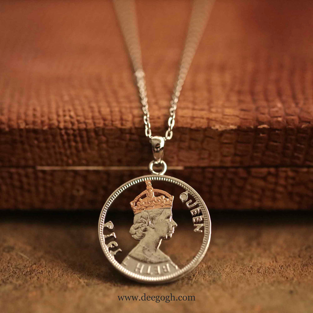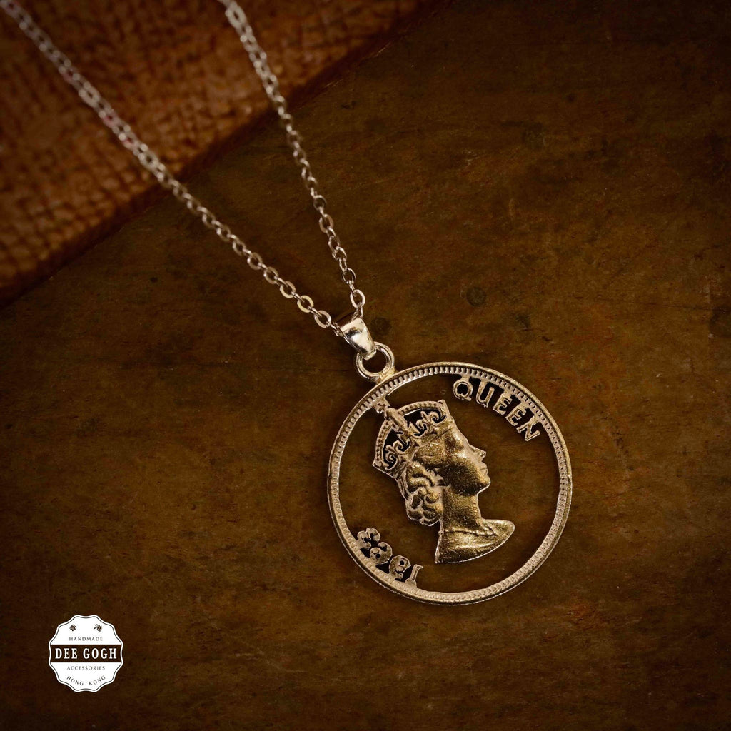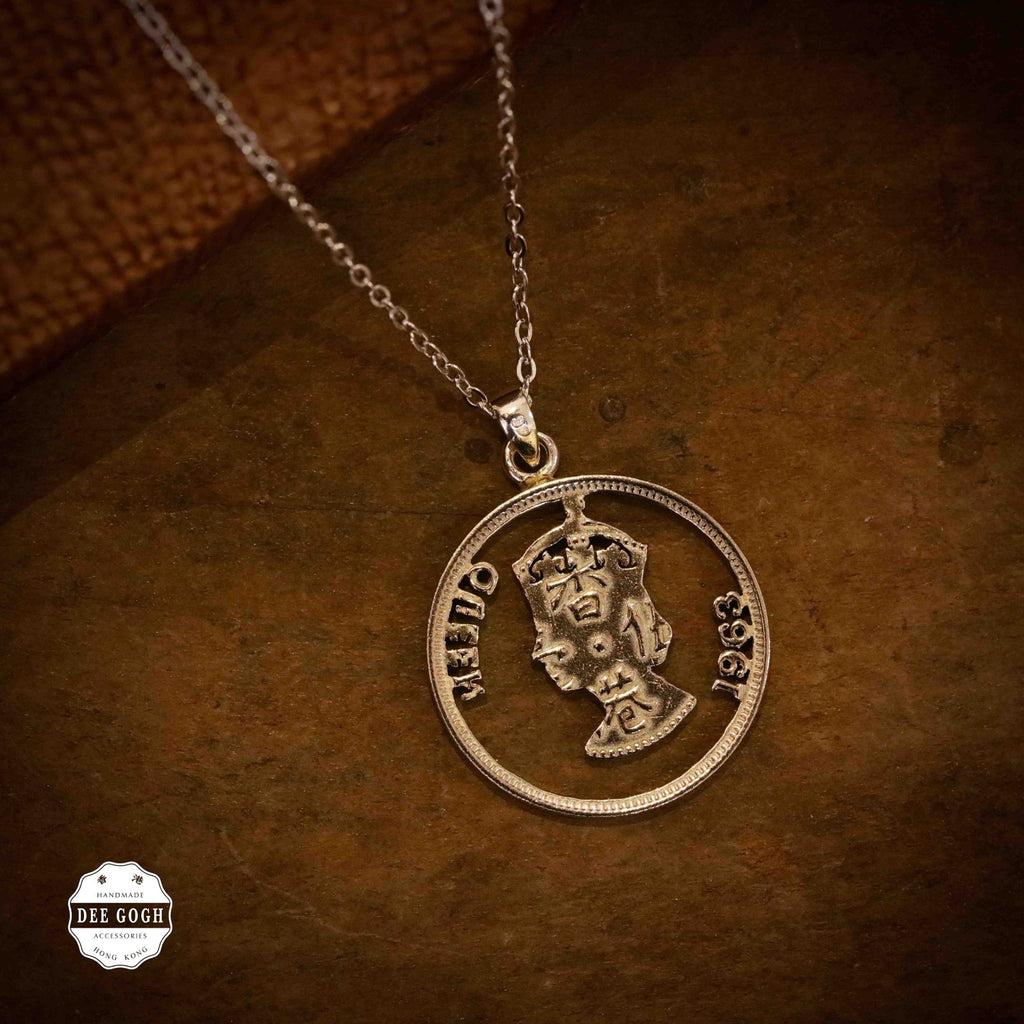 這個作品的主角為不同年份的五毫硬幣,配上雙面鏤空設計,凸顯正中的伊莉莎伯女王當時的肖像,視乎硬幣鑄造的年份,吊墜左邊的年份亦會不同。我們歡迎你挑選對你有特殊意義的年份。