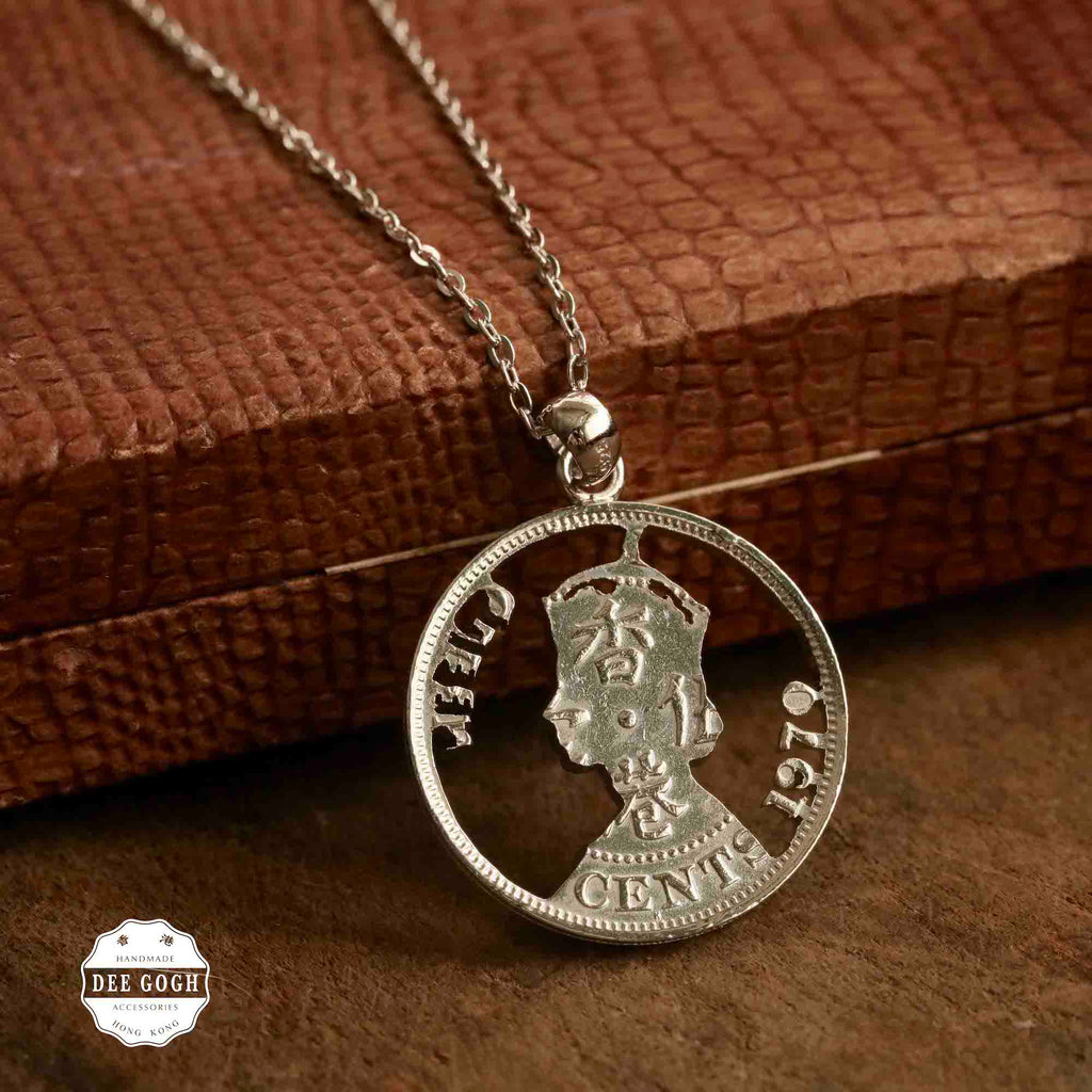 Need to change on the website so the title says with old Hong Kong 50 cent coin instead of “Hong Kong old…”. This pendant has been crafted using an old 50 cent Hong Kong coin which portrays Queen Elizabeth II facing the right in a majestic crown. The Queen has been expertly cut around as has as has the date of the coin and the word “queen.” The pendant is simplistic beauty as it sits in a perfect circle and in the image is worn on an effortless silver chain which can also be purchased here.