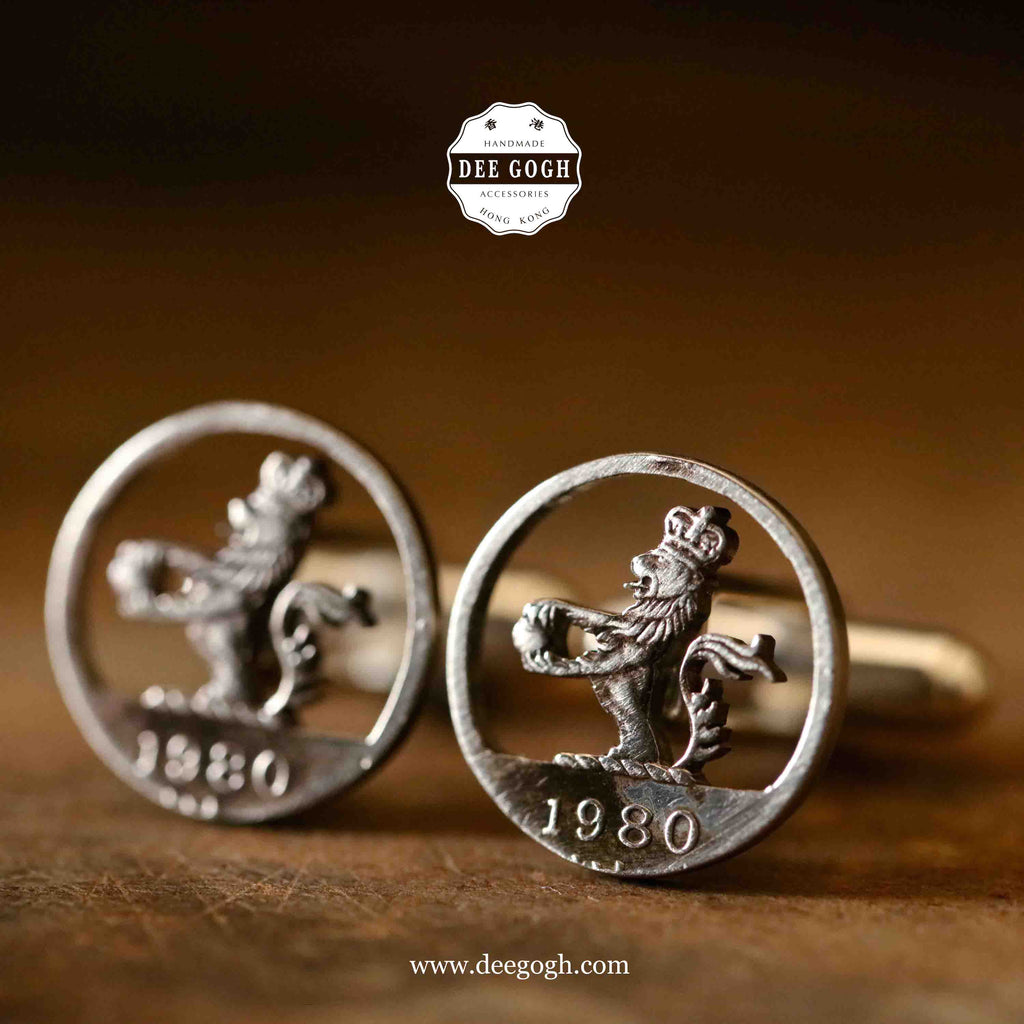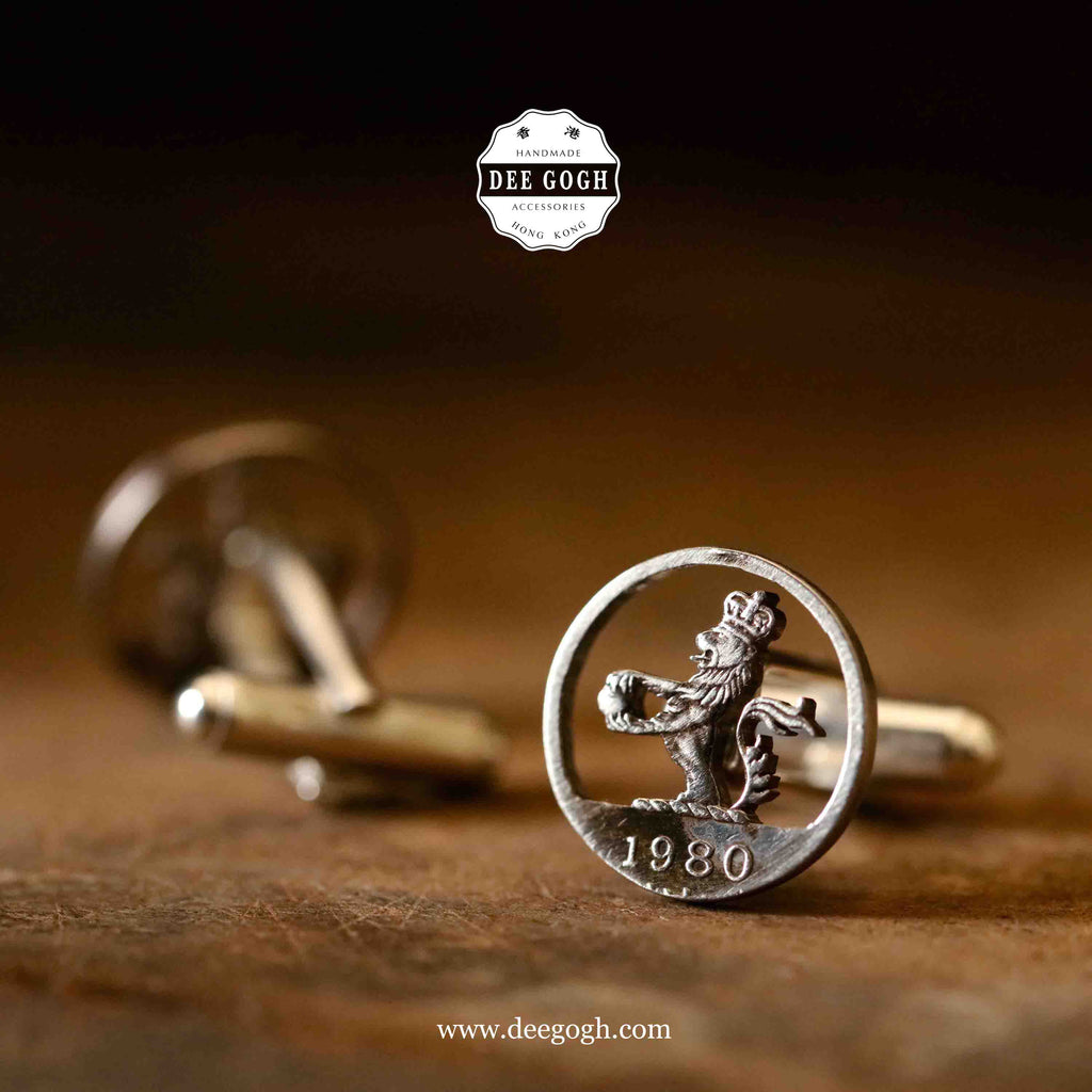 An exciting cufflinks design in timeless round shape! One of the Queen’s beasts, the Lion of England, is featured in the cutout of the old dollar(s) coin of Hong Kong. The lion of England traditionally symbolises bravery, nobility, royalty, strength, stateliness and valour.