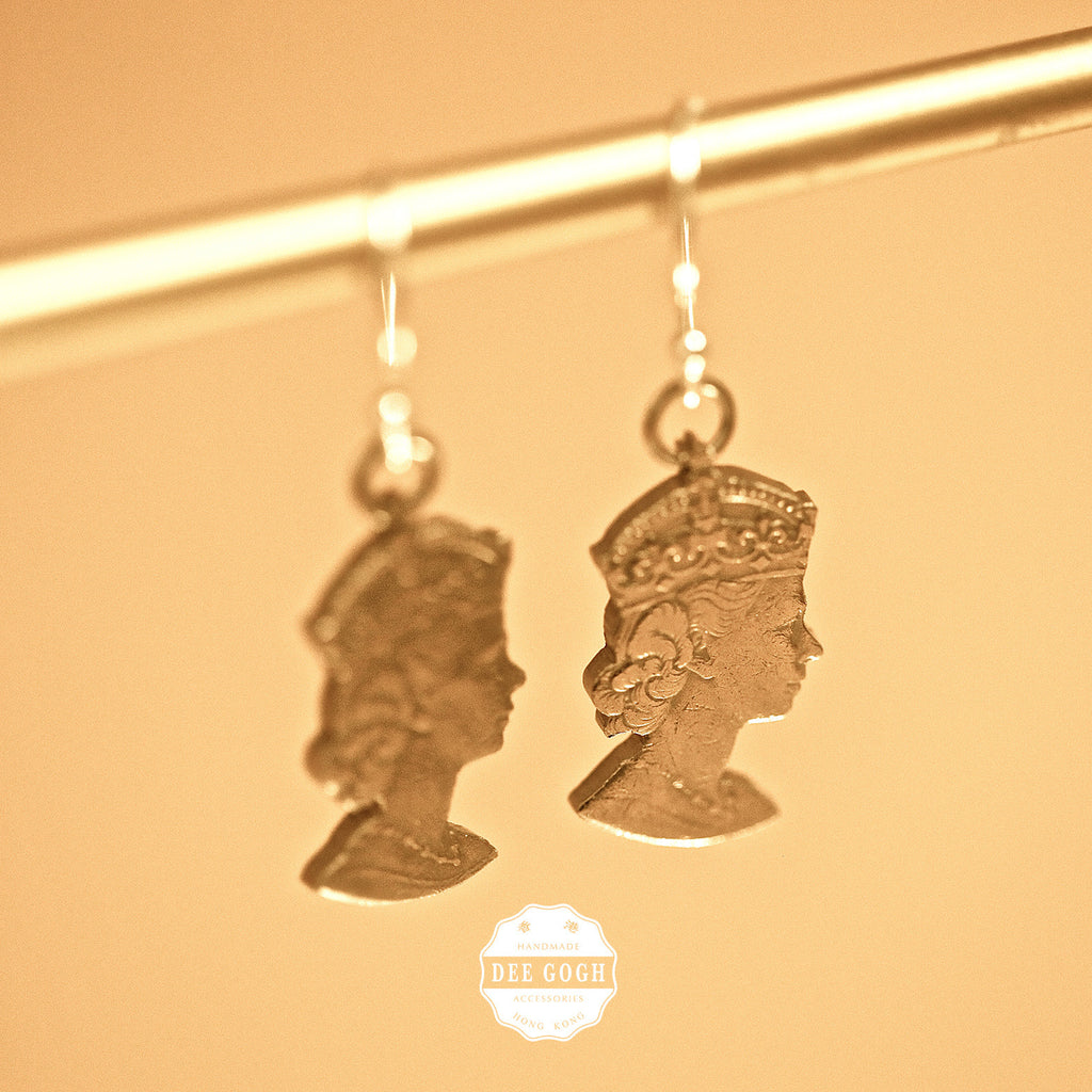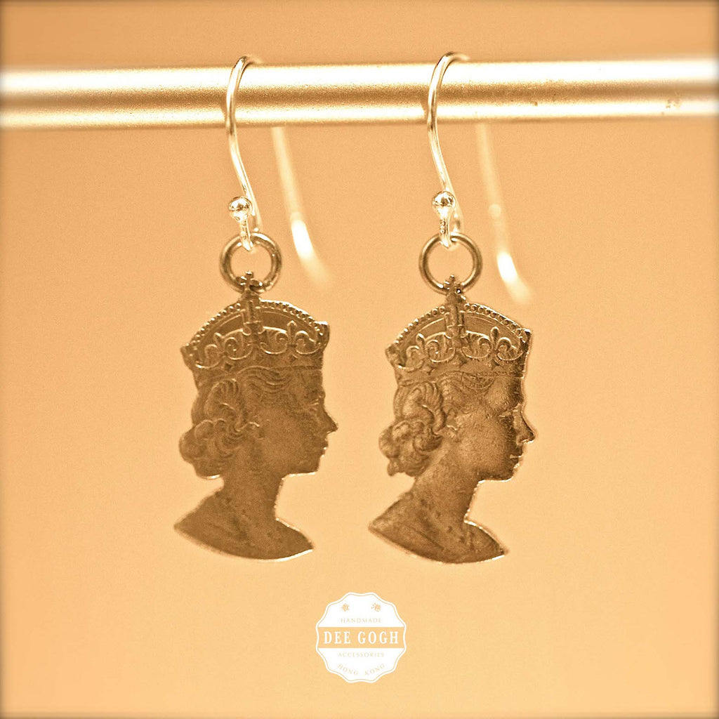 舊兩元硬幣英女王垂釣耳環(可自選年份) 每一件作品皆從來自舊兩元硬幣,隨著年份不同,手鏈中的英女王肖像亦有不同。 垂吊耳環更顯優雅,以金色配上銀色,突顯作品的細節及質感。