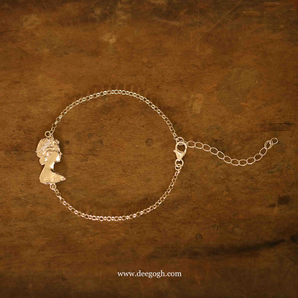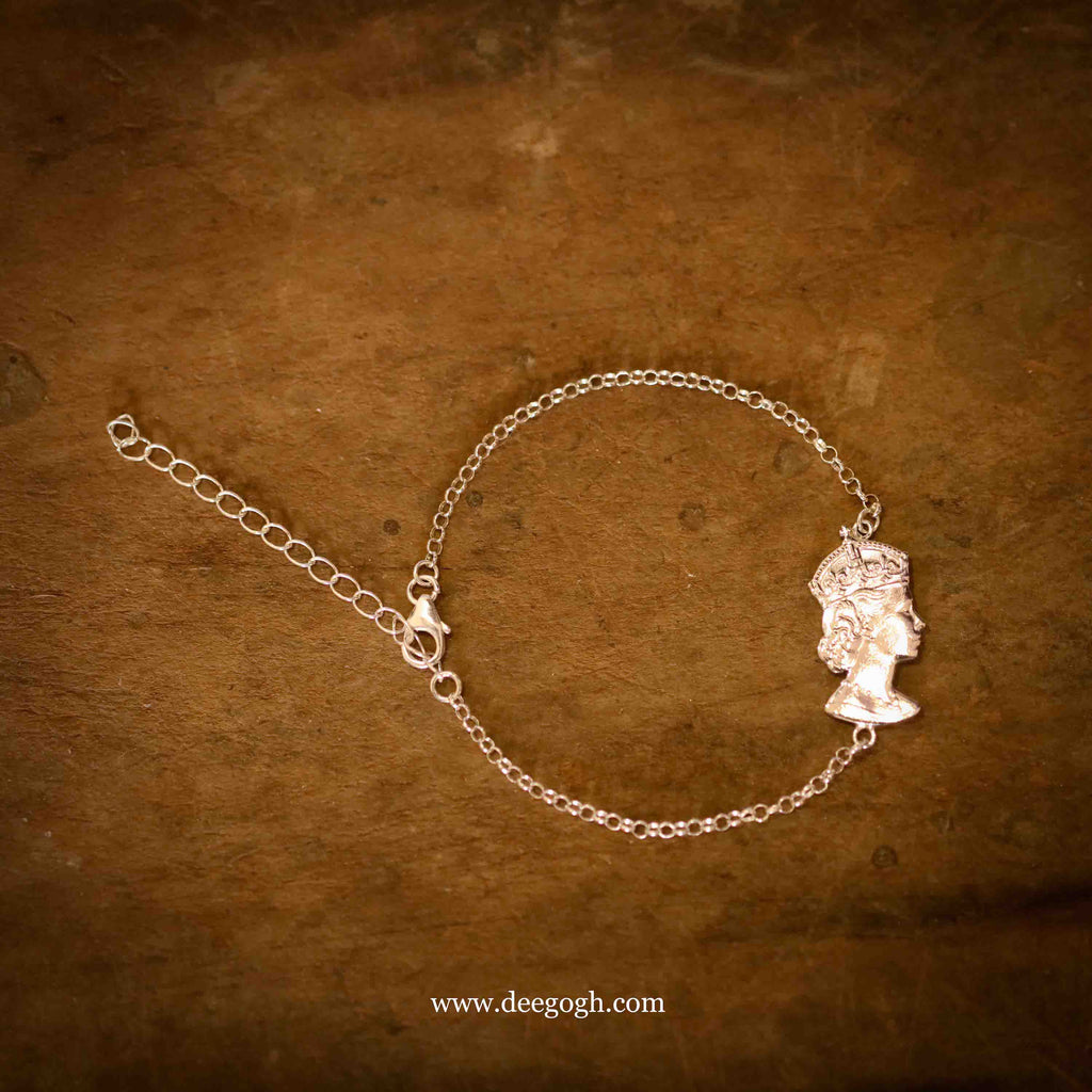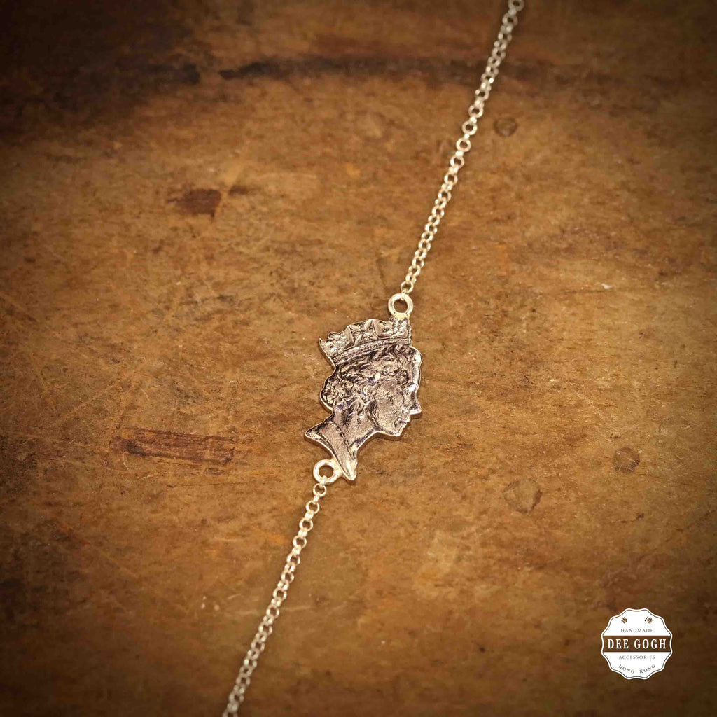 This amazing bracelet has been made by carefully cutting out the portrait of the queen from an old Hong Kong 2 dollar coin. The portrait used in the bracelet will be dependent on the year of the coin but every portrait has been cut out in such high detail that even around the trickier aspects of the crown has been done masterfully. Queen Elizabeth who is the longest reigning monarch has been attached to a delicate silver link bracelet ensuring that the queen takes centre stage within this piece. The bracelet is 15cm with an additional 5cm extender.