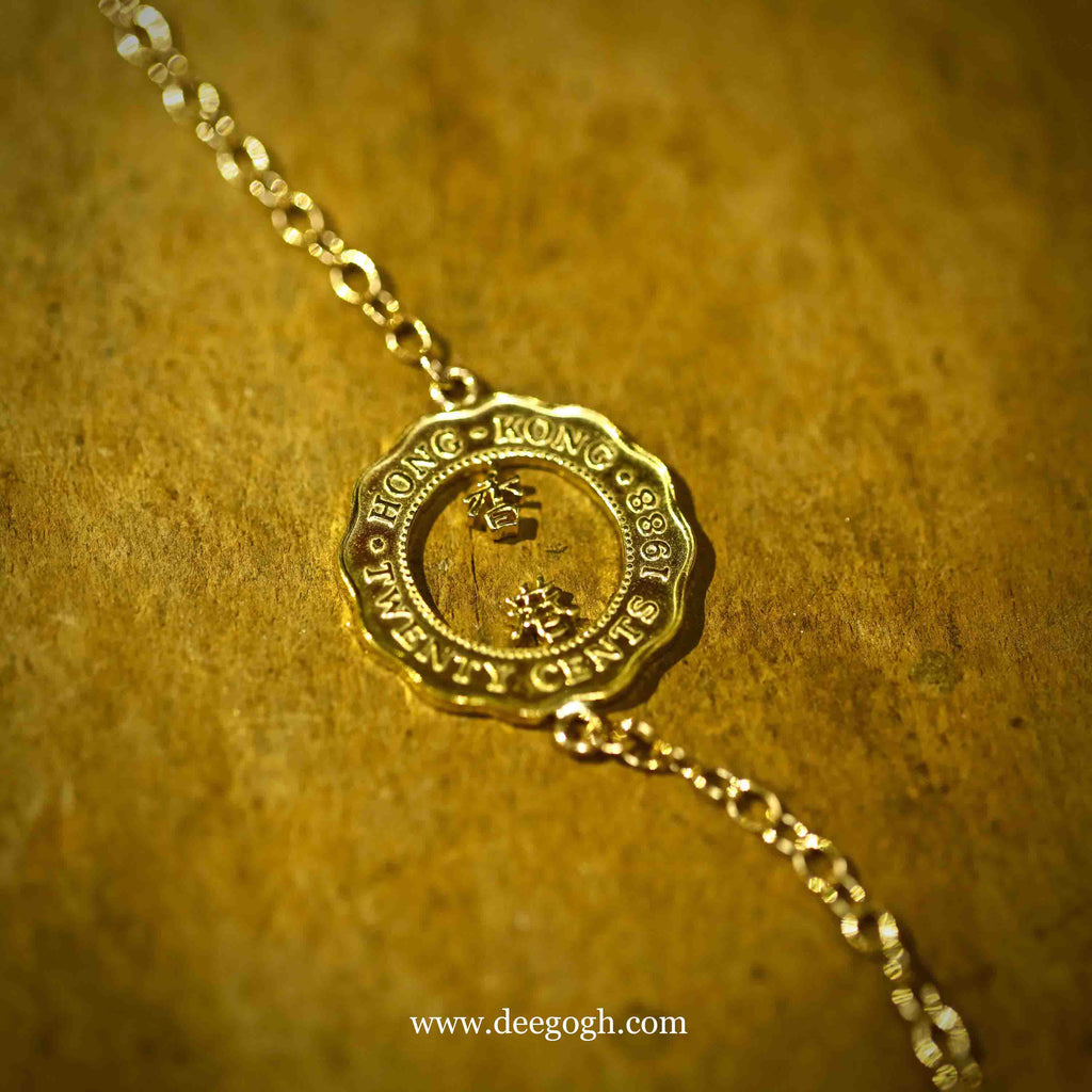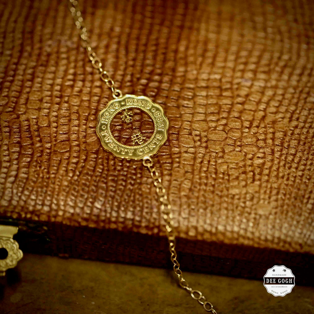 This bracelet is featuring the old Hong Kong 20 cents piece from our 'Homesick' collection and the chain is made in 925 silver imported from Italy. The coin is part of the Hong Kong dollar series which were introduced in 1975 and were minted until 1991 except 1981, 1984, 1986 and 1987.
